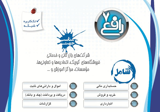 حسابداري انبار و کالا درخواست هاي انتقال کالا ما بين انبارها – عناوين هزينه هاي جنسي – عناوين درآمد هاي جنسي خريد و فروش در نرم افزار حسابداري رافع 7 اموال چک و بانک چک هاي اشخاص – حواله هاي بانکي – برگه هاي عمليات چک و بانک حسابداري: صدور قبض دريافت – صدور قبض پرداخت – فهرست قبوض درياف و پرداخت – تأييد يک يا چند سند تراز – ادغام و تأييد چند سند تراز – تهيه کاربرگ و سند اختتاميه – دفاتر و گزارشات حسابداري خريد و فروش در نرم افزار حسابداري رافع 7: کسورات خريد و فروش – اضافات خريد و فروش – فهرست کامل فاکتورهاي خريد و فروش – پيش فاکتور فروش – فروش – خريد – برگشت از خريد – برگشت از فروش – چاپ روي فاکتورهاي فروش – چاپ روي فاکتورهاي رسمي – گزارشات خريد و فروش انبار در نرم افزار حسابداري رافع 7: فهرست رسيد و حواله هاي انبار – صورت تفکيک شده برگه هاي انبار – رسيد دستي انبار – حواله دستي انبار – درخواست انتقال کالا ما بين انبارها – فهرست درخواست هاي انتقال کالا – چاپ رسمي برگه هاي انبار – گزارشات انبار و کالا اموال: فهرست کامل فاکتورهاي اموال – خريد اموال – تعميرات و نگهداري اموال – ثبت ذخاير – استهلاک اموال – فروش اموال – گزارشات اموال چک و بانک در نرم افزار حسابداري رافع 7: فهرست چک هاي شرکت و اشخاص – فهرست حواله هاي بانکي – انجام کليه عمليات بانکي مربوط به چک يا بانک – فهرست برگه هاي عمليات چک و بانک – چاپ روي چک – گزارشات چک و بانک گزارشات: گزارشات انبار و کالا – گزارشات اموال – گزارشات چک و بانک نوشته شده در تاريخ